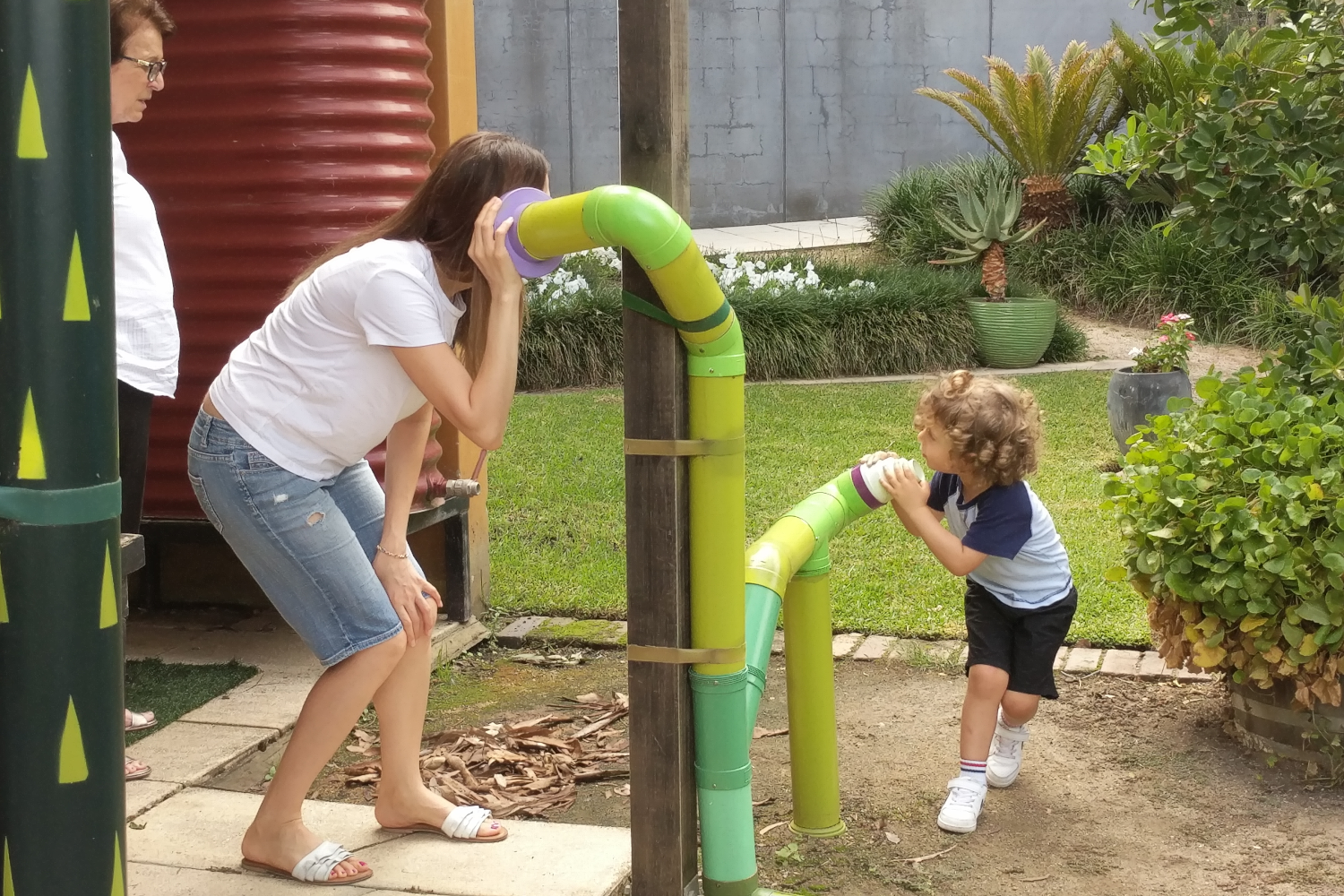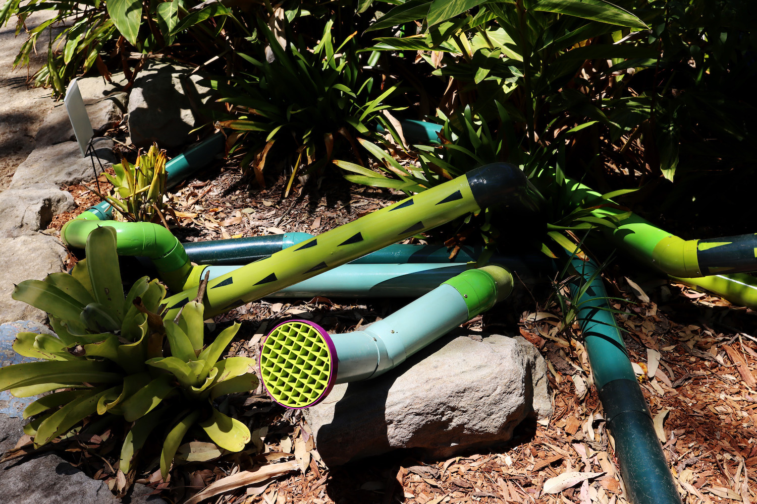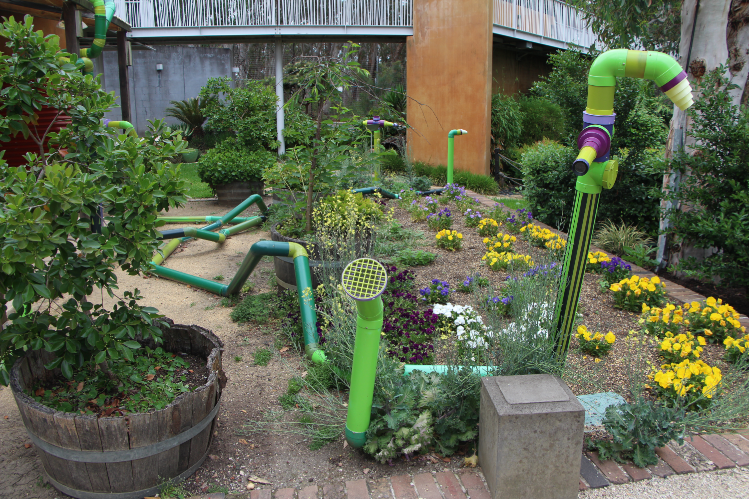 Phonosynthesis is an interactive installation that illustrates sound as an invisible but powerful movement in the air that can be manipulated, diverted and experimented with. The installation of brightly coloured interconnected pipes encourages participants to play with sound by speaking, singing, whispering, yelling, tapping rhythm and inventing new sounds to send through the pipes to unknown points in the installation. The crisscrossing network of pipes embraces random connections and non-linear conversations between strangers.